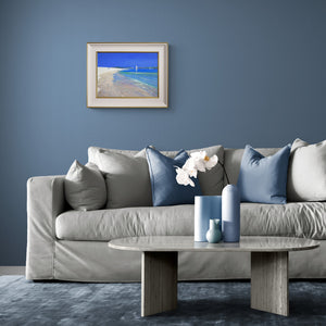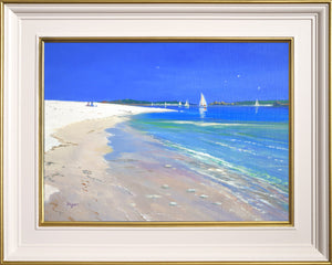 'Colours of Tresco' by Ted Dyer is a stunning 12x16 inch oil painting that captures the magic of the Cornish coastline. The vibrant blues and whites of this idyllic beach scene will transport you to the remote coast of Tresco Island in Cornwall. From the perfect blue sky, to the white sand beach and shallow costal clear water, it's easy to see why Ted chose to immortalise this incredible place in beautiful oils. The painter has expertly depicted the peaceful atmosphere of Tresco, from the sails of distant boats to deep turquoise waters, each brush stroke brings this captivating landscape to life. This painting is ideal for serious art collectors looking for an evocative painting that captures all of the colours and beauty of Cornwall. A truly inspiring artwork.