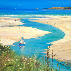 Discover the beauty of Cornwall's seascapes with this 14x14 inch oil on canvas painting by Cornish artist Ted Dyer. With a stunningly clear view to Godrevy lighthouse, this painting displays the vibrant colours of the turquoise sea contrasted with the bright white sand at Hayle and features a beautiful sailing boat sailing out from Hayle harbour. You can add this exquisite Ted Dyer figurative oil painting to your collection today and enjoy for generations to come.
