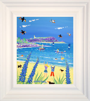 The fun and beauty of Tresco radiates from this new painting from John Dyer. The towering blue echiums in the foreground frame the fun and games on the beach and the swimmers in the sea beyond. Puffins and seagulls fly overhead, set against a perfect blue sky and fishing boats and dinghies explore the bay. If you love Tresco and the beach at Old Grimsby this is your story.