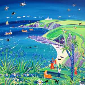 This stunning original painting by artist John Dyer captures the amazing view from Bass pont looking towards the Lizard Lighthouse. Agapanthus flowers, ferns, daisies and palm trees create a wonderful setting for the narrative of a family enjoying the Cornish sunshine and fresh air. Walkers explore the coast path and puffins and seagulls fly through the Cornish blue sky. Fishing boats and seals complete this enchanting painting.