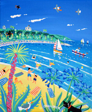 Celebrate the carefree joy of summer with 'Gylly Beach Fun, Falmouth', a vibrant acrylic painting by renowned Cornish artist John Dyer. This 12 x 10 inch canvas captures the lively atmosphere of Gyllyngvase Beach, one of Falmouth's most beloved spots. Families play in the golden sand, swimmers splash in the crystal-clear water, and colourful sailboats drift lazily on the horizon, all beneath a brilliant blue sky. The lush palm trees and blue agapanthus flowers along the shoreline add a tropical touch while seagulls soar through the skies.