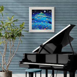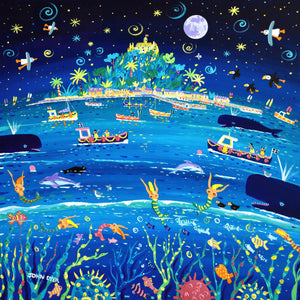 Dive into the mesmerising world of Cornwall’s coast with 'Whale Song, St Michael's Mount' by John Dyer. This breathtaking original painting masterfully unites the vibrant beauty of the Cornish seascape with the majesty of marine life. Against the moonlit backdrop of St Michael’s Mount, Dyer’s vivid colours and dynamic composition bring to life a bustling underwater paradise teeming with playful whales, mermaids, seals, dolphins, and Cornish fish.