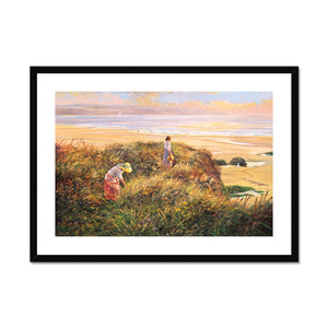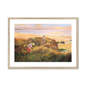 Discover the timeless beauty of 'Evening on the Cliffs' by Ted Dyer. This stunning framed and mounted print captures the essence of an evening in the dunes at Gwithian Towans on the North coast of Cornwall, looking across St Ives Bay. The warm light of the setting sun illuminates the coast, beach, and figures with a golden glow that this acclaimed Cornish artist perfectly captures.