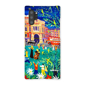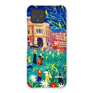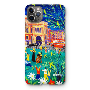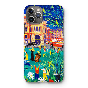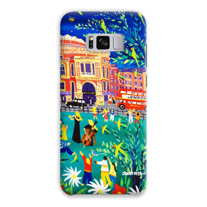 London Snap Art Phone case by British artist John Dyer who is famous around the world for his colourful and energetic art. The artist's painting 'Performing to the Parrots in the Park, Royal Albert Hall, London' is a perfect example of the artist's optimistic and narrative filled work. A detail from the painting is featured on thishigh quality Snap Art Phone case. A flautist and cellist perform in Hyde Park and green parrots fly all around. A red London bus and a black taxi cab also feature. The perfect Snap Art Phone case for anyone who loves the art of John Dyer, music, musicians, concerts, London, cello or flute playing. The case also features the artist's printed signature.