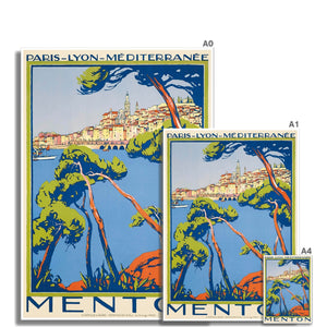 This is a museum-quality unframed open edition fine art print that features the famous Roger Broders vintage travel art poster of Menton on the Côte d'Azur in France.