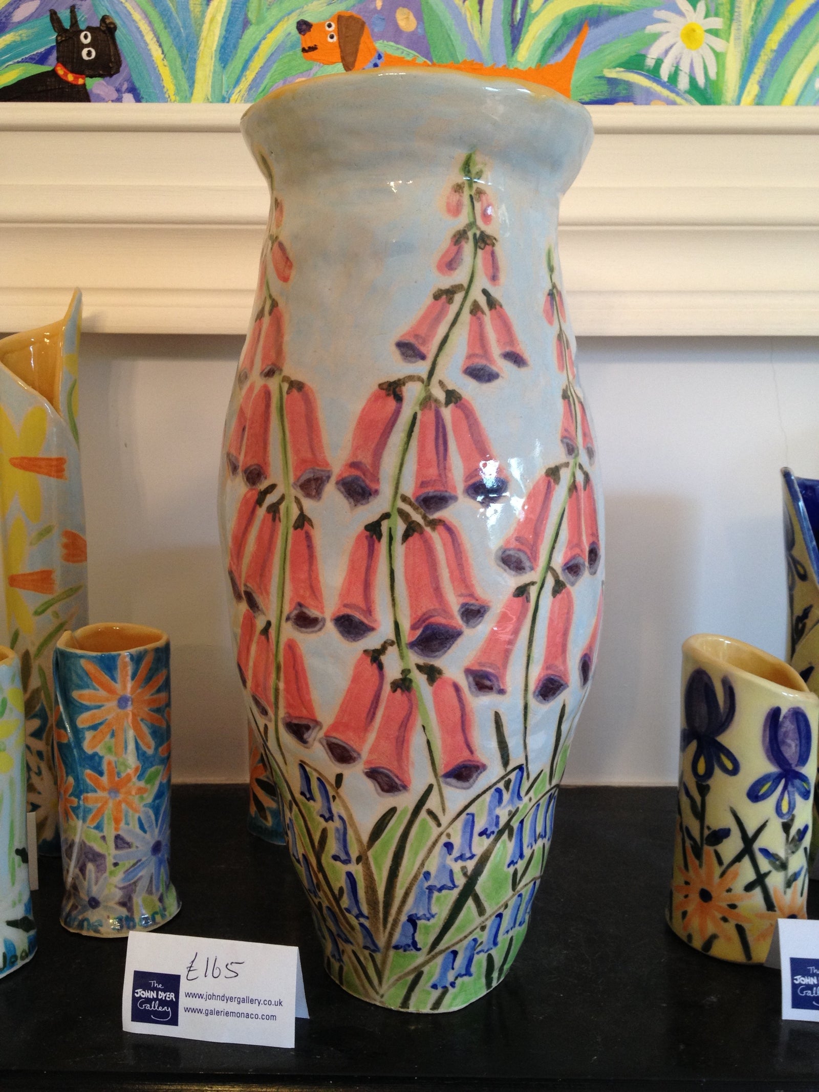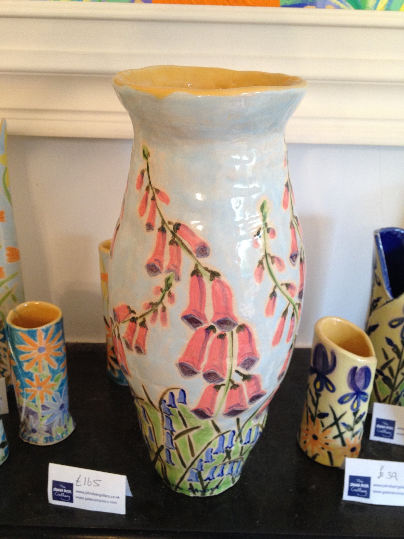 Elegant vases are glazed with beautiful colours and her use of line, composition and brushwork make these true Joanne Short paintings but in the form of Cornish pottery.