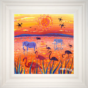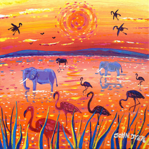 'African Flamingo Sunset, Kenya', 12x12 inches acrylic on canvas. Paintings of Africa by British Artist John Dyer.