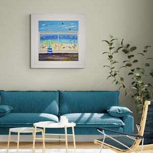 Immerse yourself in the vibrant world of Cornish art with 'Beachfront Brushstrokes' by John Dyer. This stunning 24x24 inch acrylic on canvas showcases the Porthmeor Studio view of St Ives and Porthmeor beach, capturing the essence of seaside living with pops of colour, charming daffodils in a Cornishware jug, and playful touches like seagulls and puffin. Indulge in this unique piece from our Cornwall Art Gallery and add a touch of sophistication to your collection.