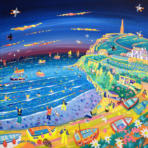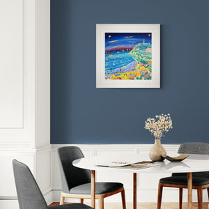 'Colourful Cape Cornwall' by John Dyer is a radiant celebration of one of Cornwall’s most picturesque and historic landscapes, brought to life in the artist’s vibrant and joyful style. This 24 x 24-inch acrylic on canvas captures the boundless energy of Cape Cornwall’s coastline under a dynamic sky streaked with warm hues as dusk sets in over the sea.