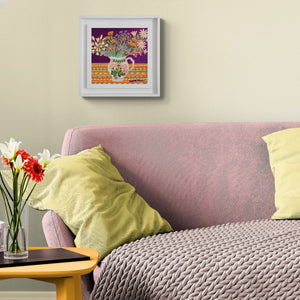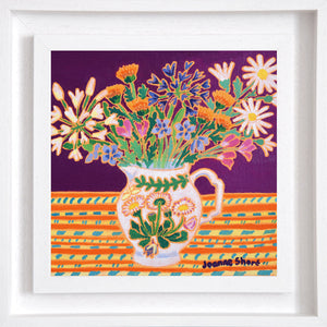 This exquisite small-format still life by Joanne Short is a vivid celebration of Cornish art and seasonal colour. A carefully gathered bouquet of Cornish garden flowers — daisies, agapanthus, calendula and bellflowers — bursts forth from a charming hand-painted Welsh jug, set against a deep plum background and a richly patterned cloth.