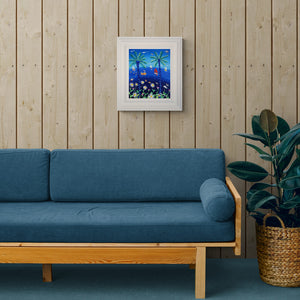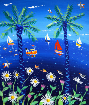 John Dyer's 'Cornish Summer' captures a stunning Cornish landscape with its beautiful blue sea, two tropical palm trees, sailing boats, swimmers, seagulls and wild Cornish daisies. This 12x10 inch acrylic on canvas will add vibrant beauty to any room. Experience Cornwall's seascapes in your home with this stunning artwork.