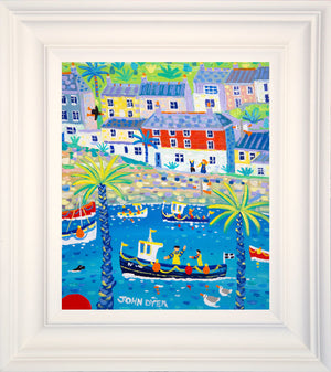 This painting of Cornwall is by John Dyer and captures a glimpse of the fishing village of Mevagissey with its colourful houses that cling to the steep sided hillside overlooking the harbour. A fishing boat is framed by two Cornish palm trees. A seal and seagulls look on as the fishermen on the boat wave to the people on the quay side. Lime greens perfectly set of the rusty red of the Cornish house in the painting and the brilliant blue sea sparkles in the sun. A wonderful painting that creates a lifelong window into Cornwall and the atmosphere of Mevagissey harbour.