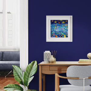 This 12x12 inch canvas by British artist John Dyer features a stunning winter night, with an explosive sky of colourful fireworks over Wells Cathedral. This painting captures the beauty of the Somerset landscape, from Glastonbury Tor in the far distance to the people below, all wrapped up in warm coats and hats. Enjoy the fabulous use of colour and narrative in this unique acrylic painting.