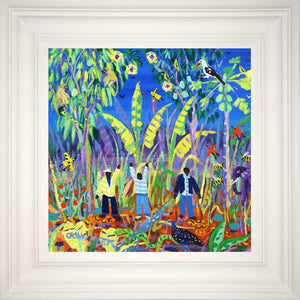 Discover a delightful blend of natural harmony between man and animal in this stunning farm painting of Meru, Kenya, in Africa. Featuring a tranquil scene of local farmers cultivating the land amid an abundance of crops and tropical fruits, it is an unhurried yet vibrant reminder of humanity's unique connection with nature. John Dyer's captivating use of colour, narrative and ethnobotany makes this 12x12 inch acrylic on canvas an excellent addition to any home.