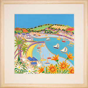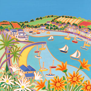 This really beautiful Joanne Short oil painting captures the rhythms and colours of the Penryn River at Falmouth. Cornish flowers and palms in the foreground frame the view of the river as we look towards the Greenbank Hotel and the Cornish village of Flushing on the far bank. Careful colour combinations create a sunny and vibrant painting full of life.