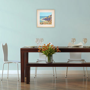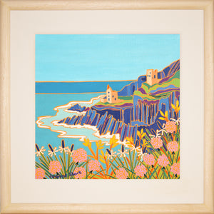 The Crown tin mines at Botallack, epitomise the rugged beauty and industrial heritage of Cornwall.This new Joanne Short oil painting of Botallack captures so much of the essence of this Cornish subject.Wild Cornish sea-pinks (thrift), wild grasses and gorse fills the foreground and the artist takes our view out across the bay to the steep rugged cliffs and engine houses beyond.