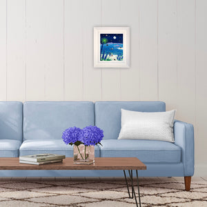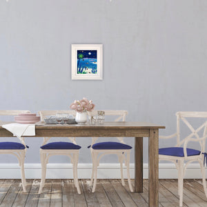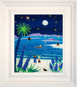 This is a truly beautiful painting of Tresco by well known Cornish artist John Dyer. The beauty of this island in the stunning Scilly Isles, is captured here, with the famous glistening white sand and puffins circling, under a full summer moon. A couple wave at a passing fishing boat while the blue echiums on the edge of the beach complete this fairytale painting.