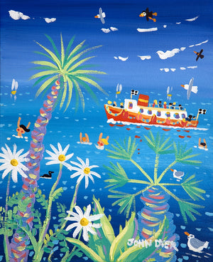 John Dyer lives and paints on the seafront in Falmouth and is inspired by all the colour and activity that he sees. A ferry boat full of excited people crosses the bay. Swimmers enjoy the brilliant blue sea and the tropical palms create a real feel of the Mediterranean. The colours of the coast and the exciting shapes of the tropical plants in Cornwall inform much of John's work.