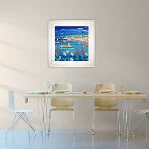 This stunning painting by Cornish artist John Dyer features the fun and colour of catching the St Mawes Ferry from Falmouth to the seaside village of St Mawes in Cornwall. Foxgloves and Cornish daisies fill the foreground through which we can see topless swimmers enjoying the cool water, seagulls and seals. A fabulously fun and narrative filled painting of St Mawes that is a fabulous example of this famous artist's work.