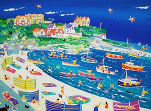 All the colour, atmosphere and narrative of the harbour in Newquay in Cornwall has been captured on this new canvas by Cornish artist John Dyer. Brightly coloured boats bob in the harbour and seagulls soar across the sky. Families enjoy the warm sand and set up deck chairs and windbreaks for a fabulous Cornish day out. Fantastic fun and a wonderful image of Cornwall.