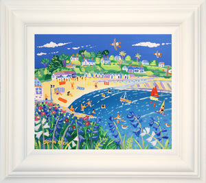 'Fun in the Sun, Swanpool Beach' by artist John Dyer captures the wonderful bluebells on the cliffs overlooking the beach. The Swanpool beach cafe features in the painting as well as the colourful beach huts that line the edge of the beach. The painting is full of narrative and colour with swimmers, sailing boats and sunbathers creating a great sense of fun. A wonderful painting that captures the essence of this beautiful beach in Cornwall.