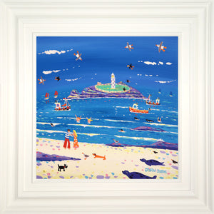 A cuddle on the beach at Godrevy lighthouse is captured in this delightful new painting by Cornish artist John Dyer. A sausage dog looks on and seagulls, a scotty dog, puffins and seals create a wonderful narrative to this Cornish painting. Skinny dippers enjoy the surf and fishing boats from Hayle and St Ives fish in the bay. A wonderful painting that captures so much for life on the coast of Cornwall.