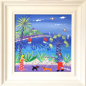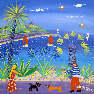 This is an absolutely delightful painting from Cornish artist John Dyer. "Love at first sight, Falmouth" features two dog walkers and their scotty dog and sausage dog on a sunny day. Agapanthus bloom and sailing boats drift around in the colourful bay. The newly planted tropical flower beds in Falmouth feature with agave, aeoniums and more. A wonderful example of this artist's work.