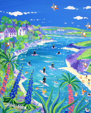 In this gorgeous acrylic painting on canvas, of The Gannel Estuary at Newquay, John Dyer captures the busy atmosphere of people enjoying their time in and around the river. With paddle boarders bobbing about amongst the swimmers; everybody enjoying the summer fun on Crantock beach. It’s holiday time all round.