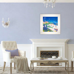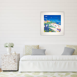 The island of Tresco, in the Isles of Scilly, is one of artist John Dyer's favourite locations to explore in paint. This delightful new painting captures the joy of a holiday on the island with white sand, wild sub-tropical flowers, seagulls, puffins and a family enjoying cycling, swimming and picnicking under a perfect blue Cornish sky.
