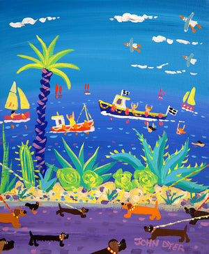 The seafront in Falmouth is a constant inspiration for artist John Dyer and this delightful new painting features the artist's dog Digory as he explores the sights and wonders on the seafront. The intriguing composition focuses on the excitement of the day with all the dog walkers out of the canvas, but we are left to imagine who they are & their eccentric hats, coats or swimsuits! Fantastic fun.