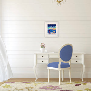In this delightful painting by artist John Dyer, snow falls gently as a couple meet on the harbour’s edge in the famous seaside town of Padstow. Wooly, stripy hats, scarves and jumpers bring the painting alive in true John Dyer style as dogs sniff their greetings and fishing boats bob in the harbour in this wintery scene which will bring a smile to anyone's face.