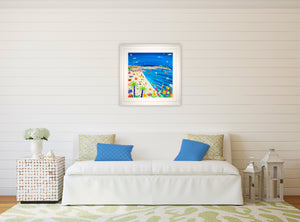 The spectacular colours and light of St Ives radiate from this new John Dyer original beach painting. The entire peninsular and the town of St Ives stretches across the canvas with the deep blue sea beyond dotted with sailing boats. The bright sand of Porthminster beach creates the stage for the narrative in the painting of surf, sunbathers & fun. Palm trees & flowers complete this stunning canvas.