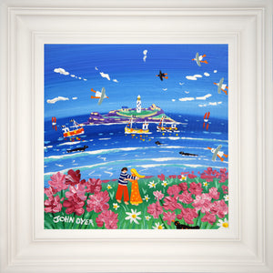 This new John Dyer painting of Cornwall features Godrevy Lighthouse on the North Coast of Cornwall. The painting really captures a sense of space with a gorgeous blue Cornish sky and the deep blue sea. Fishing boats and seals, with seagulls flying overhead, create a wonderful celebration of life on the coast. A couple have a cuddle on the cliffs surrounded by beautiful Cornish sea pink flowers. this painting is a celebration of life, love and Cornwall.