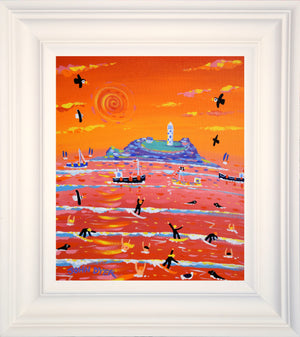 This is a fabulous John Dyer original acrylic painting of a stunning sunset at Godrevy which captures that moment as the sun is about to dip below the horizon. Surfers glide in on the clean waves, enjoying the last of the daylight and the sunset colours reflect onto a pink sea. This painting will brighten up your room and take you straight back to the beach.