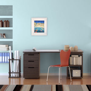 The beautiful clear aqua green blue water of St Ives harbour entices us, and the swimmers in the painting, in for a cool dip. Seals join in the fun and a fisherman gently navigates his boat back to shore. This beautiful John Dyer painting captures so much of what makes St Ives a special holiday and home location for so many.