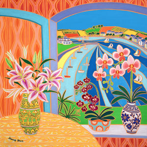 Dive into the vivid world of Cornish artistry with this remarkable Matisse-inspired oil painting by the accomplished artist Joanne Short. This coastal painting, titled 'Lilies and Orchids, Green Bank, Falmouth', unfolds a picturesque view along the river in Falmouth, beautifully framing the iconic Greenbank Hotel.
