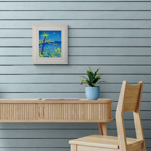 Cornish Artist John Dyer captures the beauty of Cornwall with sub-tropical plants and aeoniums against a backdrop of gorgeous Cornish blues. His work shows the fun and Mediterranean vibes typical of Castle Beach in Falmouth, including palm trees and skinny dippers. Superb colours and an excellent example of this artist's unique Cornish art.