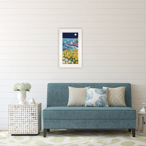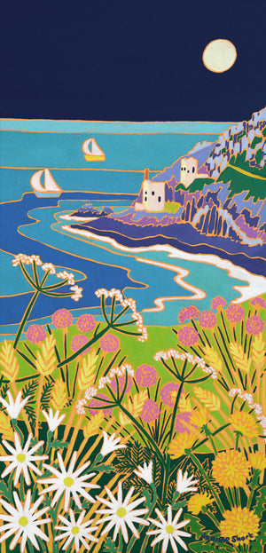 The artist has created a bouquet of Cornish wild flowers filling the foreground that creates a great sense of space between the cliff edge and the stunningly described sea below. A full moon illuminates the painting creating a magical nighttime painting that will be a feature in any art collectors home.