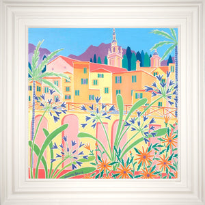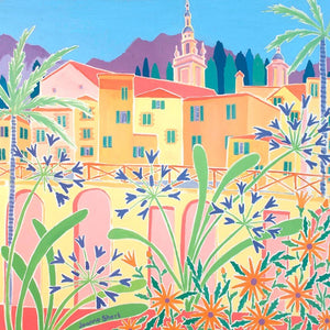 A stunning oil painting of the town of Menton in the south of France. Joanne lived in Menton for three years.This is one of her key paintings from that period. The wonderful warm colours of the buildings in the old town complement the purple mountains behind. Elegant date palms reach for the sky. The foreground is a wonderfully painted collection of blue agapanthus flowers.