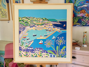Flowers in a Cornish garden peer down at the beautiful harbour town of Mevagissey. Boats nestle in the harbour under a clear blue sky, reflected in the sea, & sailing boats head out for a summer sail. Joanne's amazing use of flat oil colour combined with her flowing composition of Mevagissey & attention to detail have created a stunning painting of this much loved Cornish village. Simply stunning.