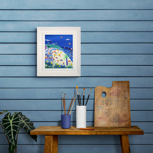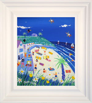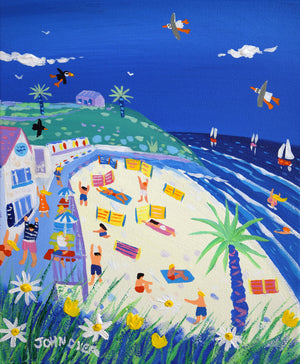Bring the beauty and vibrancy of Porthgwidden Beach into your living room. 'Perfect Porthgwidden, St Ives' by Cornish artist John Dyer evokes the Cornish landscape with deep blues, bright sand, wildflowers, sailing boats, and sunbathers. The 12x10 inch acrylic on canvas artwork will stay vibrant and be a delightful reminder of summer days for generations to come.
