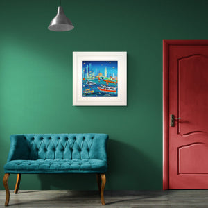 This New York painting by John Dyer is simply stunning. It captures the hustle and bustle of boats crossing the water, with the famous orange Statten Island Ferry chugging back and forth. You can almost feel the excitement of the tourists on the ferry, as they enjoy the sights of the skyscrapers on the shore. The Empire State Building stands proud in the background, adding to the majestic feel of this painting. This painting captures the excitement and energy of this great city.