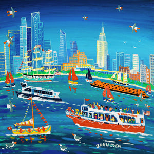 'Sailing around Manhattan, New York', 18x18 inches acrylic on canvas. Paintings of America by British Artist John Dyer. American Art Gallery