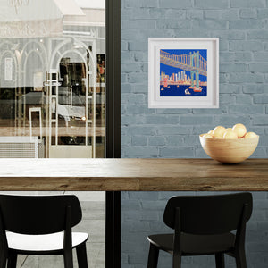 This beautiful oil painting by Joanne Short captures the view of Manhattan from beneath the famous bridges. The stunning colours and dynamic perspective make this an eye-catching and dramatic work of art from this famous artist.