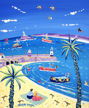 This vibrant 'Sandpiper Picnic, St Ives' painting by Cornish artist John Dyer captures a moment of relaxation by the beach with a beautiful view to Godrevy lighthouse and Gwithian beach beyond. The canvas measures 12x10 inches, and includes a captivating scene of a couple picnicking, complemented by curious sandpiper birds and the tropical foreground of palm trees. Perfect for your Cornwall art collection at home.
