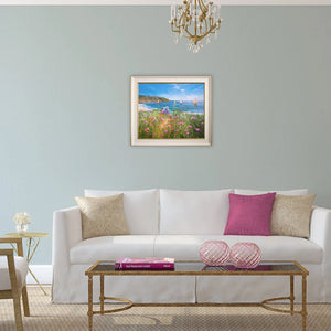 The painting has a remarkable light to it, sunlight catches the artist's sun hats and illuminates the sea pinks and sails on the classic sailing boats as they sail across the bay in front of Castle Beach.