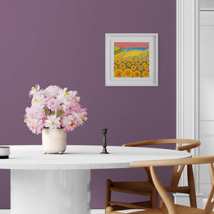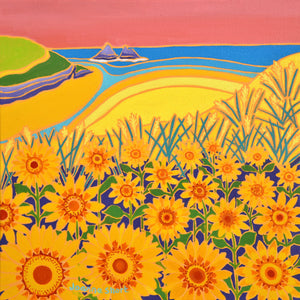 'Sweeping Hillside of Sunflowers, Holywell Bay' is a beautiful 12x12 inch oil on canvas painting by Cornish artist Joanne Short. Featuring golden sunflowers overlooking Holywell Bay beach and its brilliant blue sea, with the stunning pink sunset sky and gull rocks in the background, this artwork showcases the true jewel-like colours of Cornwall, captivating in its sunshine palette.