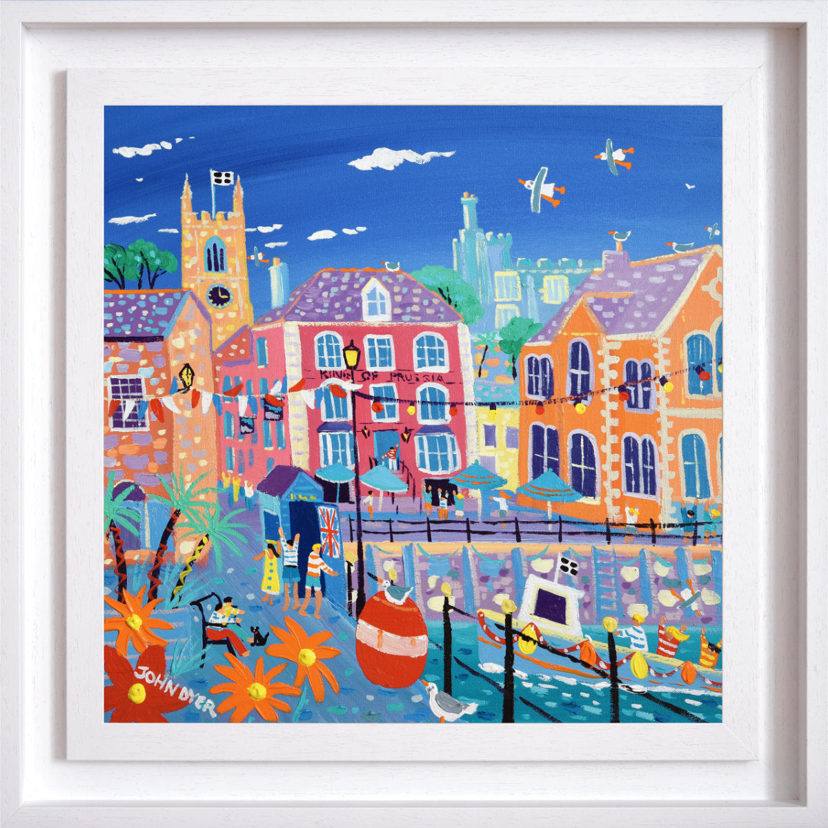 Bring the joyful heart of Fowey into your home with this vibrant 18 x 18 inch original acrylic painting by acclaimed Cornish artist John Dyer. Painted en plein air in the heart of Fowey whilst being filmed by the BBC, ‘The King of Prussia, Fowey’ captures a timeless summer’s day in this historic harbourside town, radiating life, colour, and community.