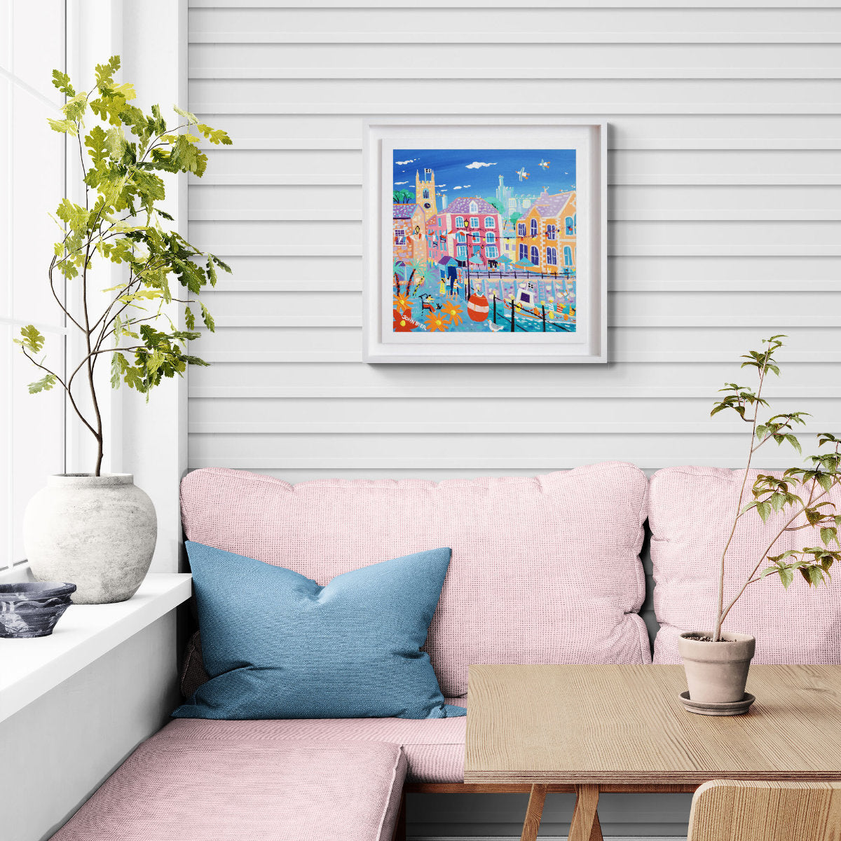 In this uplifting scene, the iconic King of Prussia inn stands proudly amidst bunting and bustling quayside life. Dyer’s distinctive brushwork and bold palette celebrate the town’s unique architecture, its cheerful café umbrellas, and the arrival of the small ferry that comes in every hour, adding a gentle rhythm to harbour life. Seagulls soar across a flawless azure sky as figures stroll along the waterfront, pausing to enjoy the warmth of early afternoon. Bright orange daisies in the foreground add a burst of floral energy.