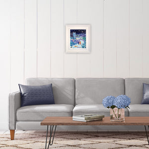This delightful new painting from John Dyer captures the joy of a snow fall at Zennor in Cornwall. Our view is back towards Zennor and the church of St Senara. Snow flakes drift down from the inky blue sky and settle on the windswept trees and the roofs of the houses. A couple wander along the snowy path with their sausage dog, who is greeted by a friendly blackbird.